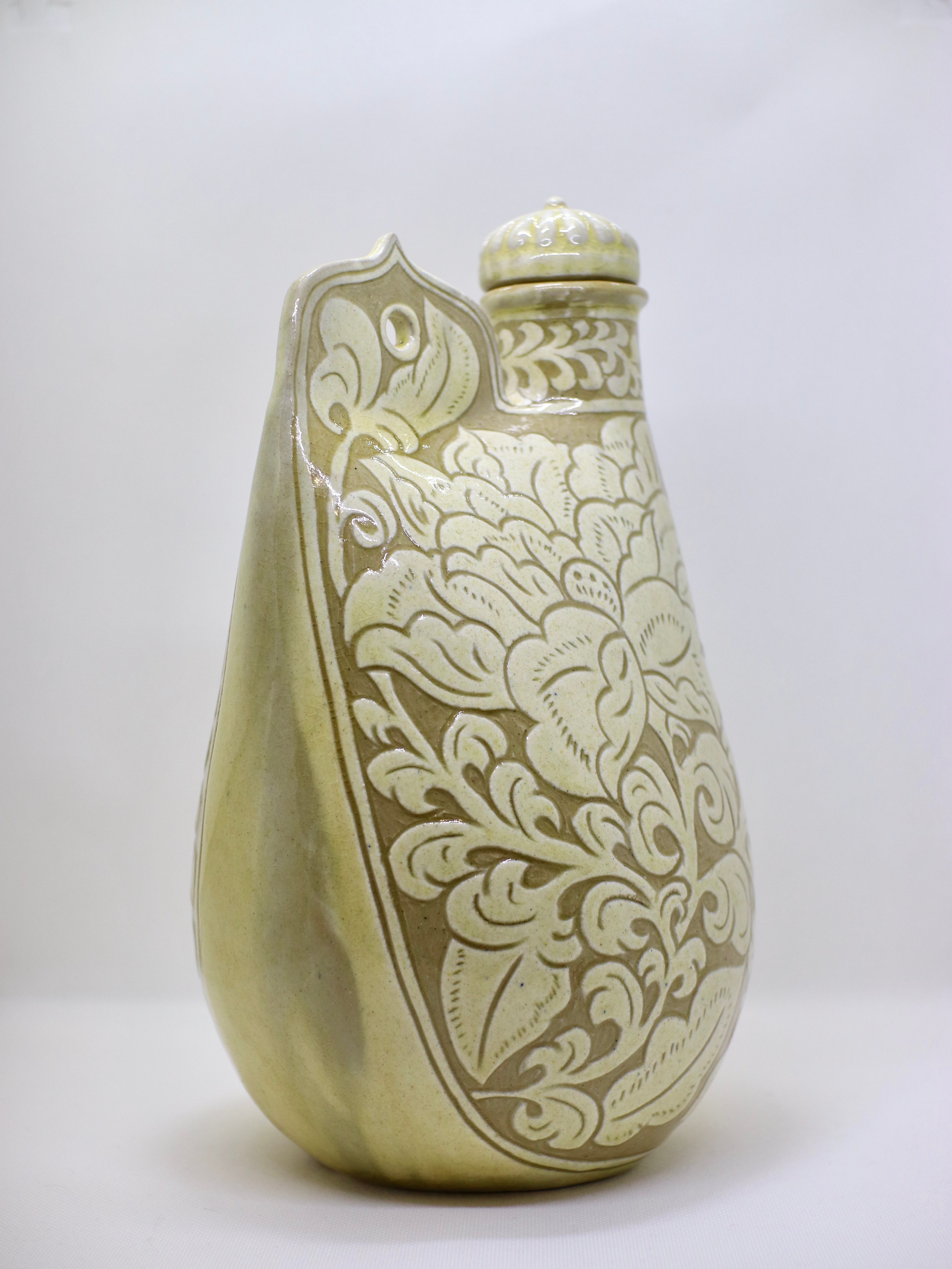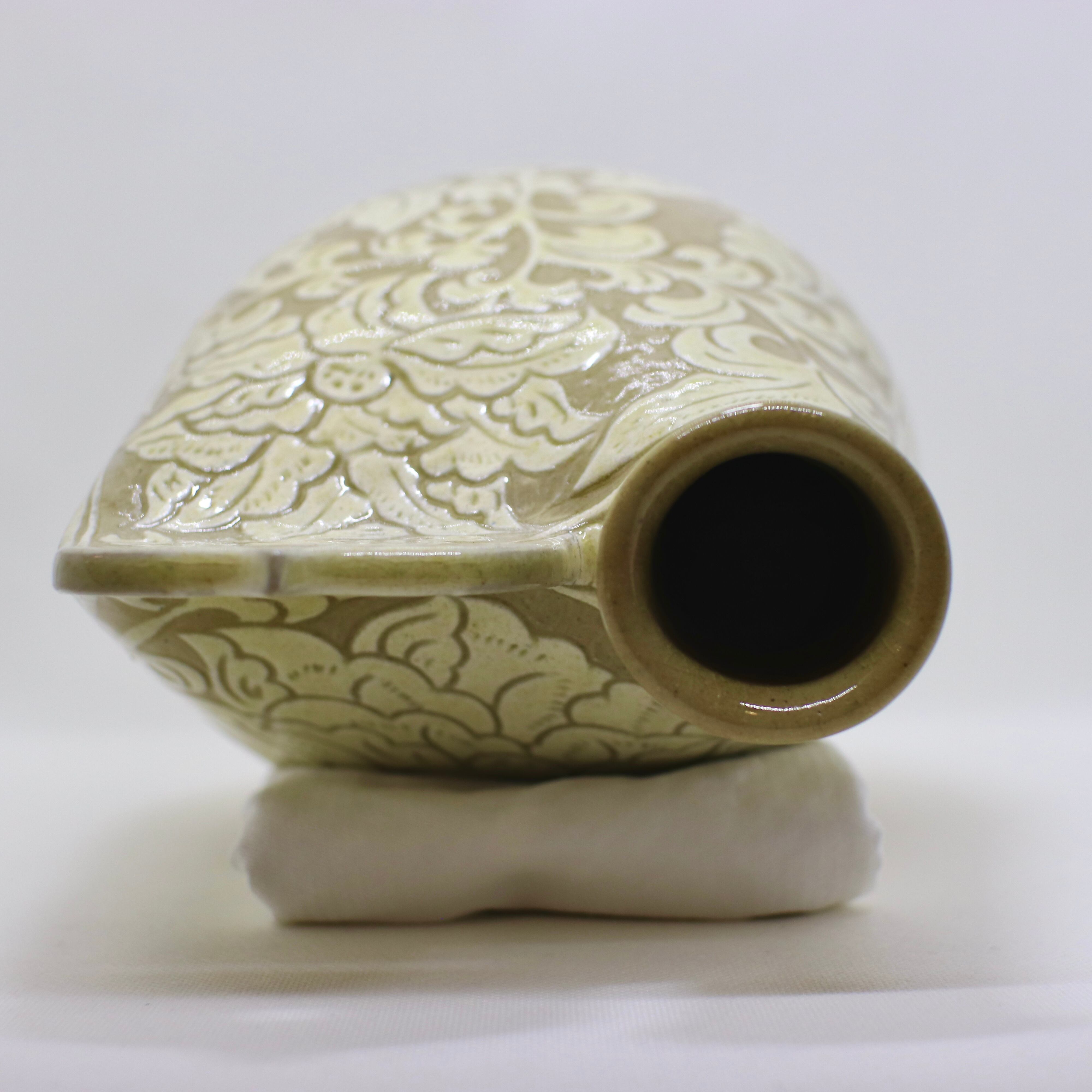 皮嚢壺(ひのうこ)は、遊牧民が水や酒を入れて携帯した皮袋(水筒)を模して作られた陶磁器です。特に中国の遼王朝時代に契丹人によって多く作られ、彼らの遊牧生活になくてはならない道具をやきもので表現しています。