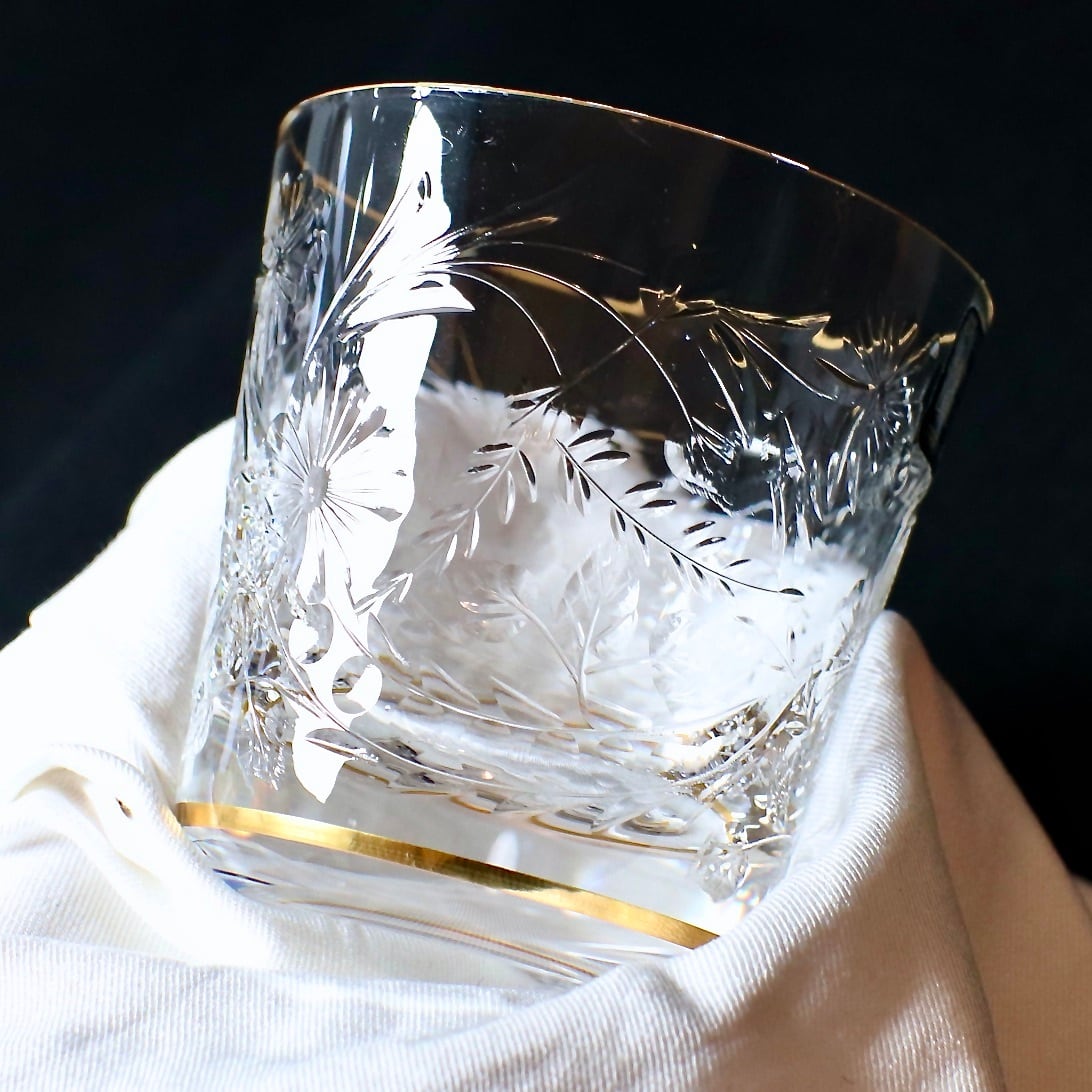 繊細なカットグラビュールで草花がぐるりとグラス全面に施されています。クリスタルならではの重量感ですが、女性の手にもちょうどよく収まります。両手で包むように持っていただくと、手のなかで野に咲く花々がふんわりと優しげに揺れているようなロマンチックな景色が広がって素敵です。指で弾くと高練度のクリスタルだけが持つ澄んだ高い音が響きます。